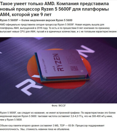 | Цитата дмитрий18корсар (  ) да меня ещё в прошлом году удивляло то, что вышли такие процы как 5500GT и 5600GT. Там прирост производительности составляет всего пару процентов из-за увеличенного буста. Там встройка есть. И для офисного компа это отличный выбор! Весь комп наверное в 25-30к можно уложить!