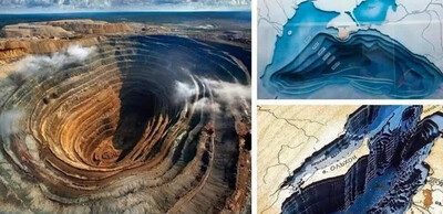 Знакомьтесь. Слева - отработанный карьер в Якутии. Не затоплен. Справа - тоже два отработанных карьера, оба затоплены. Верхний мы называем "Черное море", нижний мы называем "Озеро Байкал" КТО и ЧТО там добывал - мы не узнаем, но линии среза отчетливо видны на всех картинках.
