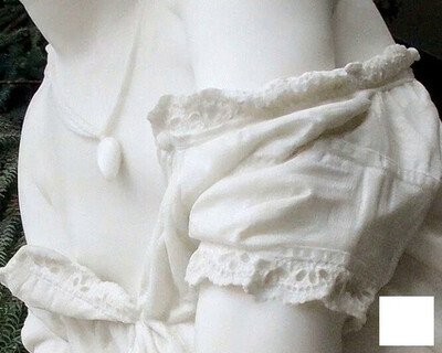 Но на платье не только складки, но и другие странные детали. С краю отчетливо видна двойная машинная строчка, причем можно различить каждый стежок. Как скульптор мог добиться такой точности и зачем вообще ему надо было вытачивать из мрамора стежки?