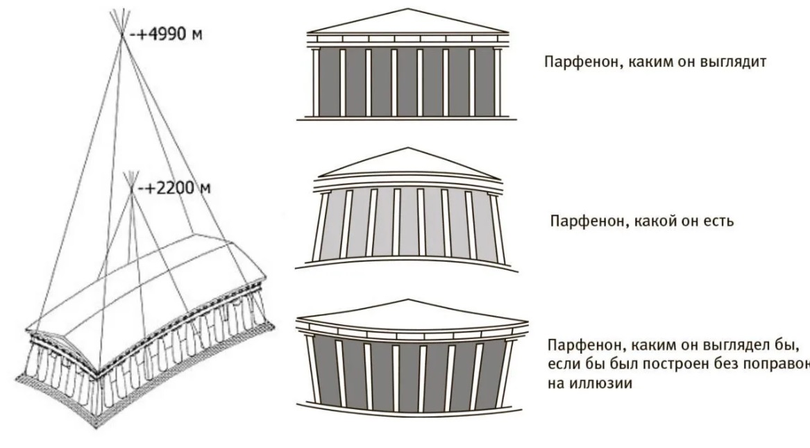 Храм богини Афины, Парфенон - огромное по масштабу строение, но кажется стройным, изящным и прямым. Секрет в том, что там нет ни одной прямой линии. оптической иллюзии глаза человека.