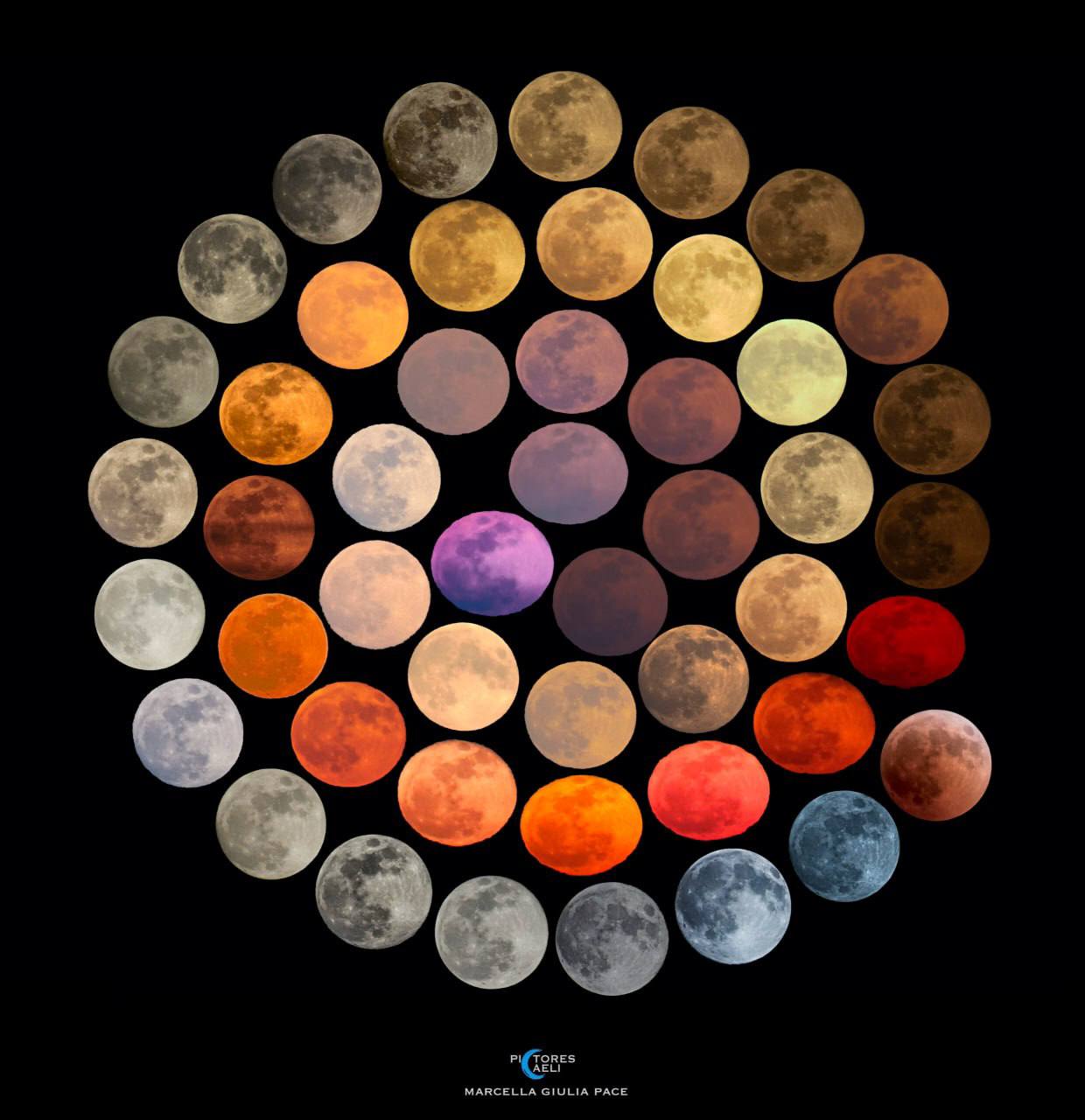Настоящий цвет нашего спутника серый с коричневатым оттенком. Однако, если смотреть на Луну сквозь атмосферу Земли, то цвет будет совершенно иным. На этом изображении представлена коллекция оттенков полной Луны. Эти снимки сделала астрофотограф Marcella Giulia Pace, на протяжении 10 лет она "охотилась" за полнолуниями из разных регионов Италии. Луна окрашена в красный или желтый цвет, когда она видна около горизонта. Луна, окрашенная в голубой цвет – более редкое явление, оно может возникать, когда в атмосфере находятся крупные частицы пыли. Пока не ясно, почему Луна бывает пурпурной. Это может происходить из-за сочетания нескольких эффектов.