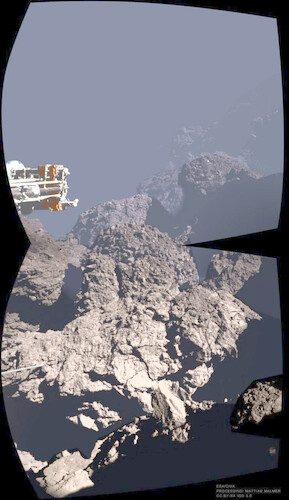 Это реальная фотография! Фотография другого мира… В 2014 году маленький космический аппарат Philae, отделившись от миссии Rosetta Европейского космического агентства, отправился в свободное падение к ядру кометы 67P/Чурюмова-Герасименко. Он должен был закрепиться с помощью гарпунов, но все пошло не по плану: посадка превратилась в серию отскоков и неуправляемых кувырков. В результате Philae оказался в тени скалы, откуда сумел передать уникальные кадры окружающего ландшафта. Перед вами панорамное изображение с поверхности кометы, собранное из двух снимков, поэтому его обрезка выглядит необычно. Оно было колоризировано и дополнено глубинными эффектами специалистом Матиасом Мальмером, чтобы мы могли в полной мере оценить, насколько безумно впечатляющим является этот вид.