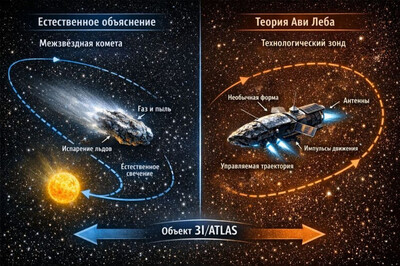 Загадочный 3I/ATLAS словно живой: хвост, сигналы и пульсирующие струи могут говорить о том, что это инопланетное устройство. Межзвёздный объект 3I/ATLAS не просто удивляет астрономов — он ставит их перед вопросом, который звучит почти как научная фантастика: может ли это быть технологический аппарат инопланетного происхождения? Узкополосные радиосигналы, пульсирующий свет и странный конусообразный хвост делают его поведение крайне необычным для кометы. В середине ноября астрономы зафиксировали узкополосное поглощение на частотах 1665 и 1667 МГц, связанных с микроволновым переходом гидроксила), который исследователи давно считали потенциальным каналом межзвёздной связи. Это был чистый, узкий сигнал — не шум, не случайный выброс, а что-то с очевидной структурой. Через две недели появились новые данные: на одном из самых чётких снимков видно пульсирующую струю, которая периодически светлеет и темнеет. Гарвардский астрофизик Ави Леб описывает это как «сердцебиение» объекта: масса выбрасывается каждые 16,16 часа. «Первоначально мы думали, что колебания связаны с вращением ядра, — говорит Лоэб, — но ядро слишком тусклое. Источник колебаний — хвост. И он пульсирует». Ученых поражает, что узкополосная радиосигнатура и пульсации струй подчиняются одной логике: первый возникает в моменты пикового аэродинамического напряжения, вторые связаны с внутренним механизмом объекта, а не с вращением. Такие закономерности крайне необычны для естественных комет, где наблюдается лишь хаотичное выделение газов. Не менее странно поведение струй. Они сохраняют стабильное направление относительно фоновых звезд, несмотря на солнечное давление и движение объекта. В природе такого не бывает: обычные джеты пыли всегда реагируют на свет и вращение. Всё это указывает на внутренний механизм, который управляет истечением вещества в предпочтительном направлении. Совпадение радиосигналов с периодическими пульсациями струи наводит на мысль о связанной системе. По мнению Лебa, «технологический объект может пульсировать выбросом в качестве формы тяги или маневрирования». Струи могут не только выбрасывать массу, но и предсказуемо изменять среду вокруг объекта, создавая наблюдаемое узкополосное поглощение. Если 3I/ATLAS управляется, возникает вопрос: что именно делает этот межзвёздный гость? Контролируемая пульсация может быть двигателем, системой стабилизации или даже сигналом. Линии поглощения могут быть побочным продуктом этих действий или частью целенаправленной активности. Приближение объекта к Земле к 19 декабря требует максимально точного отслеживания времени между выбросами «сердцебиения» и радиопоглощением. Если две системы синхронизируются, это станет сильнейшим доказательством того, что 3I/ATLAS ведёт себя как устройство, а не как обычная комета. ООН уже запустила планетарную защиту, а международная группа учёных начала двухмесячные наблюдения с 27 ноября. Новые фотографии поражают: светящееся ядро, конусообразная форма и странный хвост длиной более 965 тысяч километров направлен к Солнцу, а не от него, окружён яркой дымкой. Астрономы впервые заметили 3I/ATLAS в июле, когда он мчался со скоростью 210 тысяч километров в час. Это третий подтверждённый межзвёздный гость нашей системы. Леб выделил 12 аномалий: хвост направлен к Солнцу, объект меняет цвет, ку