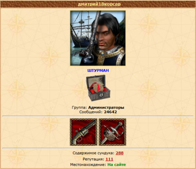 | Двери таверны открыты круглосуточно! К вашим услугам горячительные и прохладительные напитки, отменная пища и хорошее настроение!  Наше меню:Стр. 1:Стр. 2:Фирменная Яичница "По Корсарски"Всегда в ассортименте "Кабанчик на вертеле"Обслуживающий персонал: