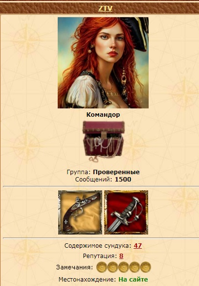 | Двери таверны открыты круглосуточно! К вашим услугам горячительные и прохладительные напитки, отменная пища и хорошее настроение!  Наше меню:Стр. 1:Стр. 2:Фирменная Яичница "По Корсарски"Всегда в ассортименте "Кабанчик на вертеле"Обслуживающий персонал:
