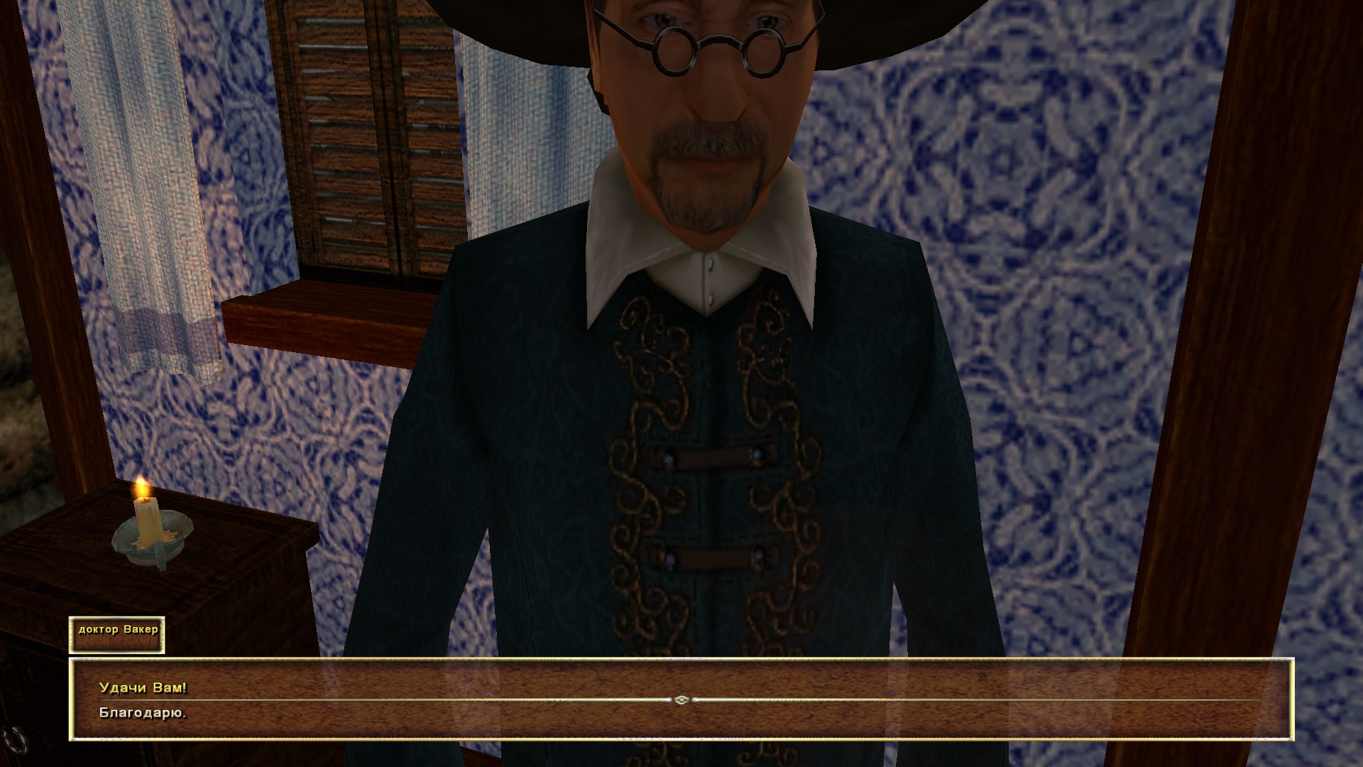 Этот вариант с боевкой, если сомневаетесь в своих силах, то выбирайте другой. С хозяином таверны нельзя говорить о оружейнике и если даже заговорили, то нужно отказаться от платы за сведения. Дом оружейного мастера находится слева от резиденции. Подойдя к дому, вы увидите, как туда проник подозрительный человек. Сообщите об этом любому солдату в городе, тот бежит проверять, в чем там дело и пропадает. Заходите в дом, на лестнице вы обнаружите убитого солдата, заберите у него оружие и сохранитесь. В комнате на втором этаже вы найдете оружейника и как оказалось из обрывка их разговора, испанца. Предстоит нелегкая драка, комнатка маленькая и в ней не побегаешь как в джунглях. Испанца можно легко убить пользуясь сливом (сейв/лоад – перезагрузка), сохраняйтесь после каждого удачного удара и тут же делайте перезагрузку, у вас оружие окажется в руках, а у испанца в ножнах, поэтому вы успеете сделать лишний удар, когда энергия закончится, вставайте в блок, постоянно сохраняясь, пока энергия не восстановится, если испанец пробьет блок, опять перезагружаетесь. В Мод-паке сохранение в бою с оружием в руках блокировано, кроме сложности «Матрос», поэтому если он у вас установлен или вы хотите честно и своими силами убить испанца, то пользуйтесь финтом (Ente+ПКМ), противник при рубящим ударе проваливается и теряет энергию, вы же успеваете нанести ему удар. После убийства испанца, оружейник в благодарность за спасенную жизнь, дает вам оружие.
