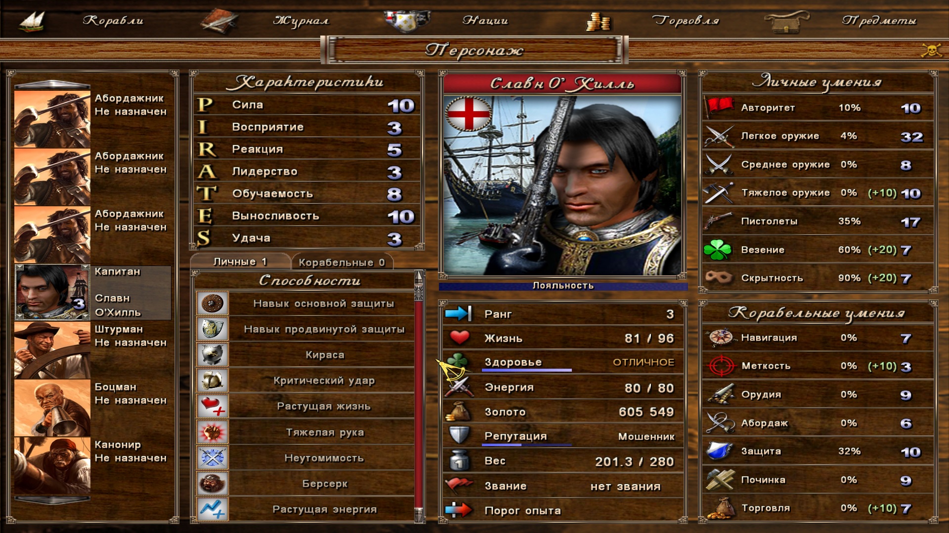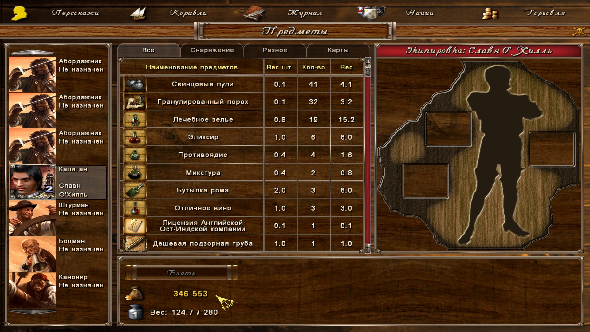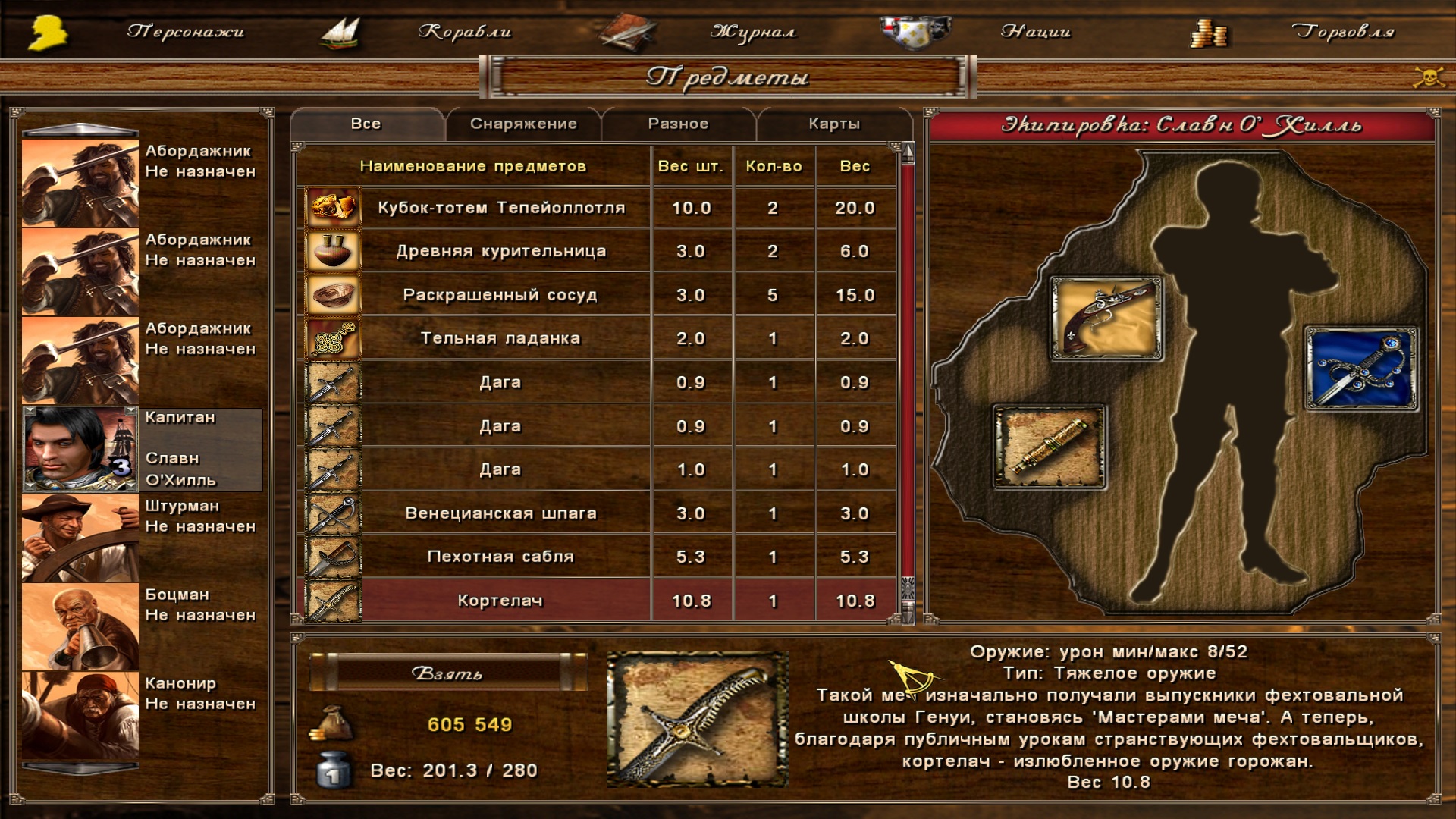 И последнее, рекомендую не продавать “Синко Льягас”, т.к. это довольно мощный квестовый фрегат. Лучше поставить его на стоянку в портовом управлении и пересесть на корабль своего класса (посмотреть таблицу классов можно в интерфейсе, нажав на Навигацию ПКМ), иначе от минусов в статы житья не будет или временно посадить на него офицера, а самому плавать на корабле своего класса. Я обычно сажаю Огла для начала и никогда не ставлю в порт, ибо даже с минусами у вас будет преимущество в морских сражениях на таком корабле.