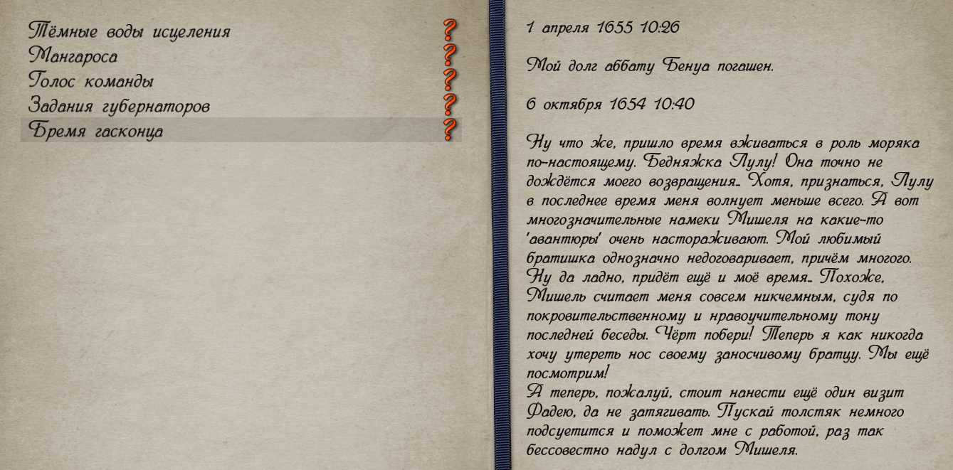 | Всем привет, начал проходить игру пару дней назад, прошел пролог и начальные квесты на мартинике, поговорил с братом финальный раз (там где он говорит что фадей подсунул мусорную дагу и говорит чтоб я вернулся к нему с просьбой о работе) - так вот после этого я как то отвлекся в целом на совершенно другие квесты и фри-плей, вспомнил о том что в квесте надо было зайти к фадею только через пару месяцев игрового времени, но как я понял уже слишком поздно - к сообщению прикрепляю скриншот чтоб вы видели точно на каком этапе сюжетном в "бремени гасконца" я нахожусь, так вот вопрос - я заруинил себе сюжетку полностью? а то я уже выполнил половину всех важных квестов, взял 7 ранг и вообще как то не хочется заново начинать из за этого. Я не против потерять какие то награды за квесты, но я просто хочу быть уверен что я смогу начать голландский гамбит позже когда буду готов, это же еще возможно?