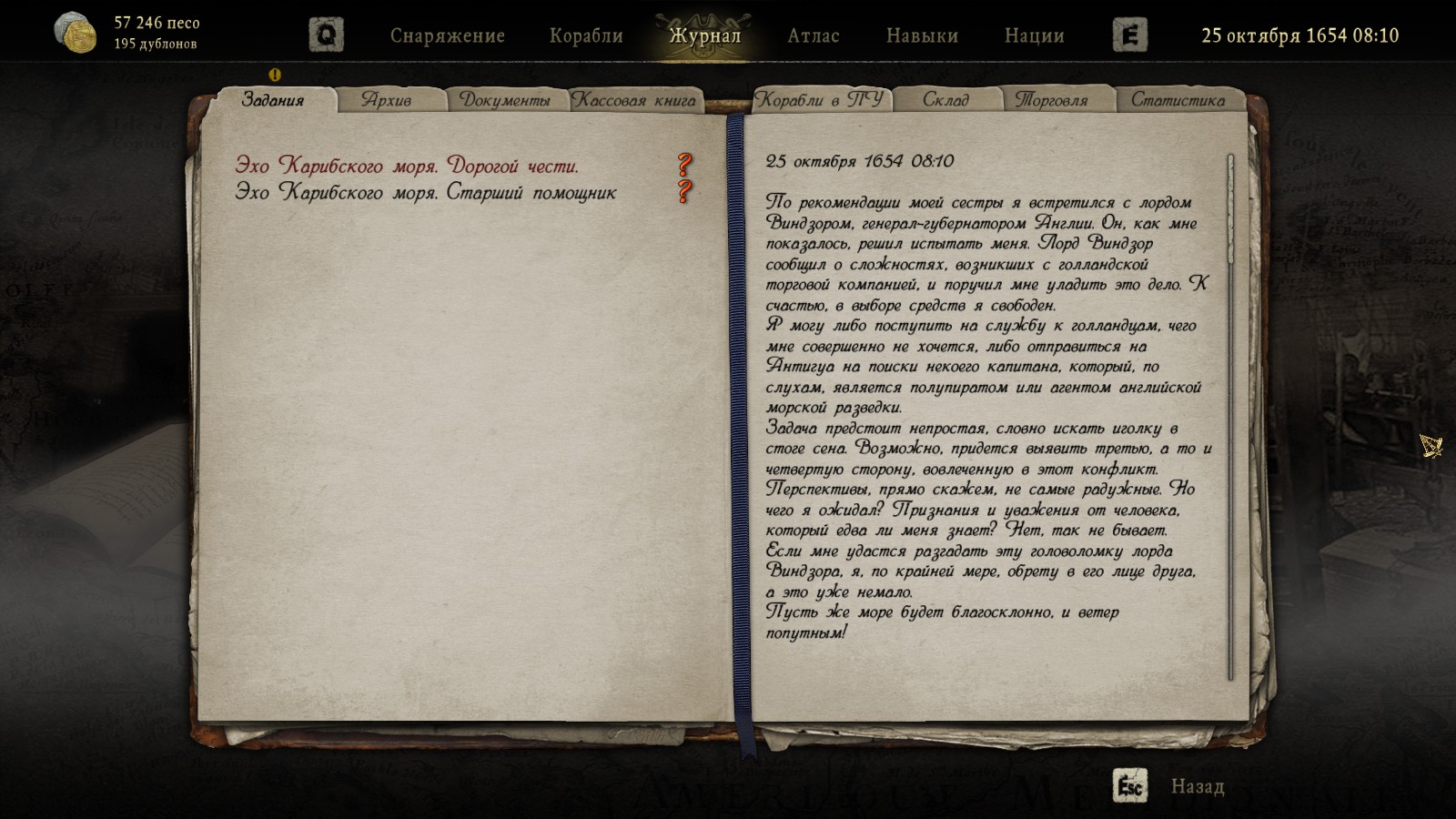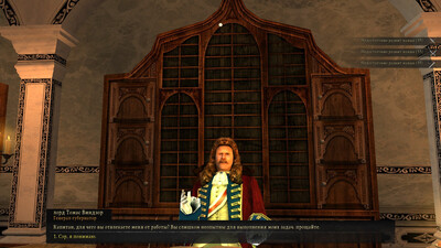 11. Готовность есть по сюжетным линиям "Голландского гамбита", "Пиратской саги" и "Под Флагом Весёлого Роджера". Сейчас в разработке я использую лорда Виндзора как персонажа для этих веток. В будущем я собираюсь переписать их, чтобы они были связаны с Элизабет и старпомом.