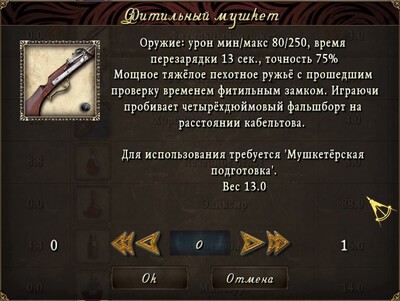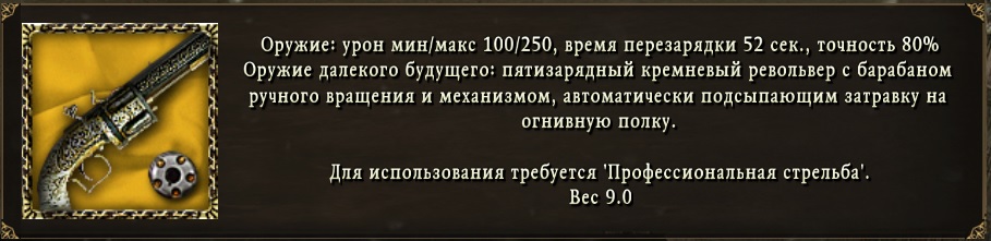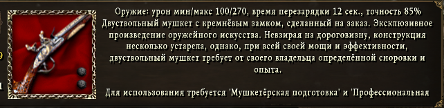 | Цитата inter (  ) перезарядка 52 секунды максимальный урон 250.. двуствольный мушкет посильнее кажется.. да и на пули не надо гемора столько Подозреваю, что тут есть возможность 5 раз подряд пальнуть (было 4)! Так что - ХЗ