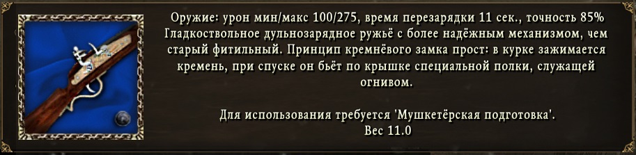 Добавлено (31 Марта 2026, 22:52) --------------------------------------------- перезарядка 52 секунды максимальный урон 250.. двуствольный мушкет посильнее кажется.. да и на пули не надо гемора столько
