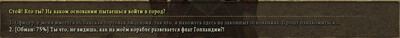 | Еще по поводу скрытности. Сто процентов достигаются, к тому же если бегать по горуду и каждый раз когда стражник тебя отвлекает дается опыт в скрытность.. то есть бегай хоть весь день по городу и качай скрытность.. однако опыт идет если стражник сам тебя окликнул.. если ты обращаешся к стражнику то опыт получаешь стандартно 3 раза только.. само собой так как шанс обмана 100% то у них нет шанса