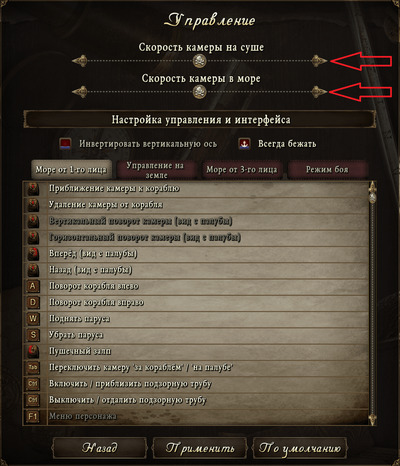 Если в игре персонаж или корабль слишком быстро (либо наоборот, слишком медленно) двигается в разные стороны (вправо/влево), то необходимо подвигать вправо/влево ползунки скорости камеры на суше и в море. Для этого зайдите в настройки игры и выберите раздел "Управление":